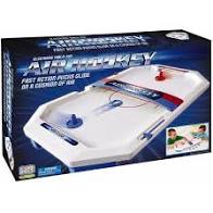 - This air hockey table is equipped with electronic air flow that keeps the puck hovering for uninterrupted gameplay. Enjoy a fast-paced, classic air hockey match as you compete with your opponent to score 10 goals. The cushion of air allows the puck to glide effortlessly as you shoot it into your opponent's goal. With its arcade-like gameplay, this tabletop game is perfect for two players, ages 5 and up. Simply insert 2 "C" batteries (not included) and get ready for endless entertainment! Product dimensions are 20.5" L x 13.5" W x 3.5" H and includes an electronic air hockey game, 2 bridge pieces, sticker sheet, 4 paddles, and 6 pucks.